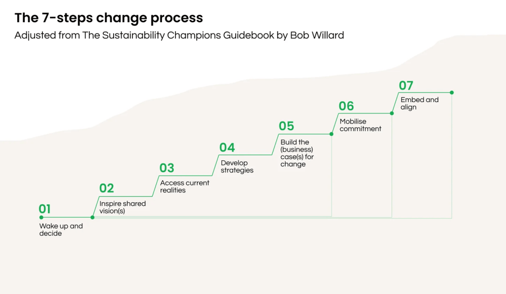 Choosing the penguin’s habitat (the icebergs) as a setting and its state of melting as a plot dilemma felt timely in our society’s fight to stop or reverse climate change. This led me to consider how Kotter’s classic framework can be contextualized in sustainability change management. I found a framework by Bob Willard in his book The Sustainability Champions Guidebook (2009). Let’s compare it to Kotter’s model.